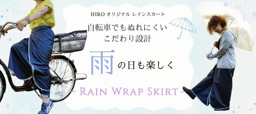 工房ヒロジャパン オリジナル商品 大人気商品。 生地が新しくなって新登場。おしゃれなカラーバリエーションがふえました! ちょっとした雨に便利なレインスカート。 自転車をこいでも、ひざ下が濡れにくい! おしゃれなレインスカート ロング丈 お手持ちのレインコートやポンチョに合わせやすいネイビーベース。 自転車をこいでも、裾がめくれ上がりにくいように! 雨の日に、ひざ下が濡れにくいように! 自転車のタイヤに裾が巻き込まれにくいように! スタッフが試乗を繰り返しながら、設計しました。 徒歩でのお出かけ時にもおしゃれで最適。 ・縫製しっかり、日本製。 ・雨の日に安心。撥水加工。 ・足さばきがいいのに、濡れにくい構造。 ・きれいなシルエット。 ・簡単着脱。職場や駅に着いたらさっと着脱。 ・収納袋付き(撥水加工)バッグの中も濡れずに安心。 ・持ち歩いても、かさばらないサイズ感。 ・品番:SK2510 ・サイズ:フリーサイズ 総丈:85cm ウエスト:目安64〜95cm (内側ホック3か所と、バックルで調整可能) ・カラー:ブラック・カーキ・ベージュ・ライトネイビー ・重さ:220g(収納袋付き) ・発送方法:追跡可能郵便(ポスト投函) ※宅急便(日付指定可能)をご希望のお客様は、別ページ「宅急便送料」をあわせてお買い求めください。 雨の日の幼稚園・保育園の送迎に。通勤・通学にとっても便利! プレゼントやギフトにも喜ばれます! ・車輪に生地が巻き込まれないよう、十分ご注意ください。 ・生地に強い力が加わると、縫い目が避ける恐れがあります。 ・使用により皮膚に異常が生じた時はご使用をお止めください。 ・ベルトは他の物に絡まないように調整しご使用ください。 ・水や汗に濡れたまま長時間放置しないでください。 ・使用後は汚れや水分を拭き取り、風遠しの良い場所で乾燥させてください。 ・撥水機能は使用状況や経年変化により弱まります。ご了承ください。 ・濡れたまま他の物に触れ続けると色移りの可能性があります。 ・生産中に発生するシワが稀にあります。 ・生地の裏に撥水加工のムラによる白いスジが稀にあります。 ・ご使用の液晶ディスプレイの違いなどにより、表現される色味が異なる場合がございます。予めご了承ください。