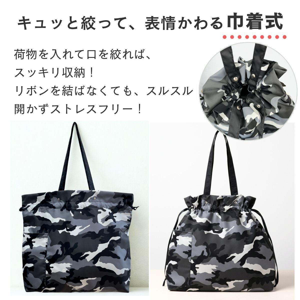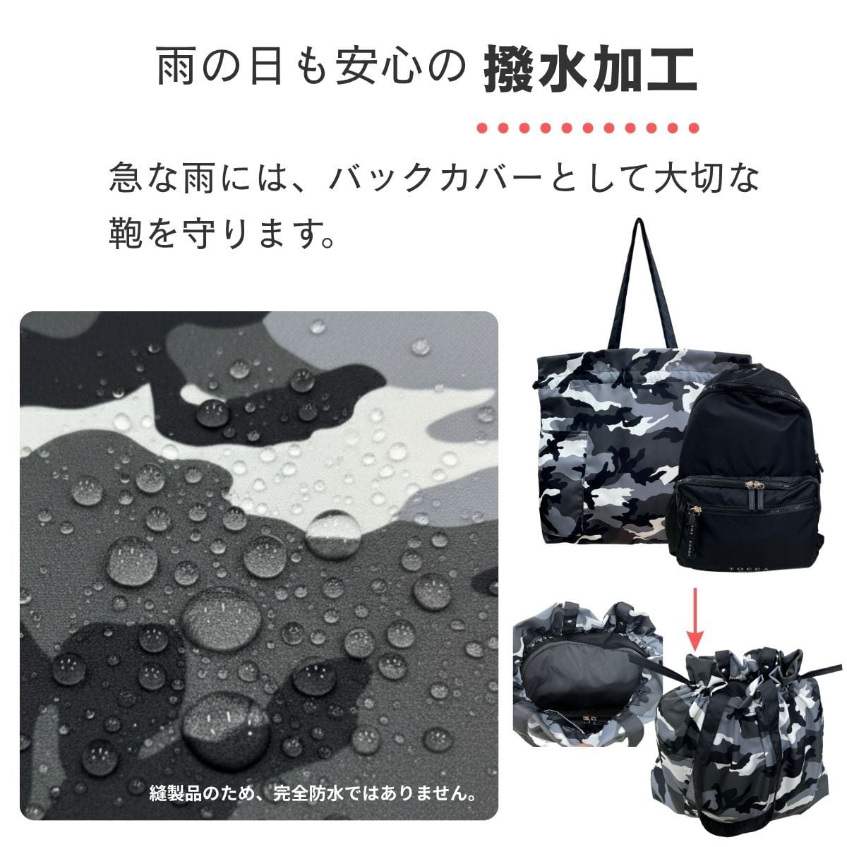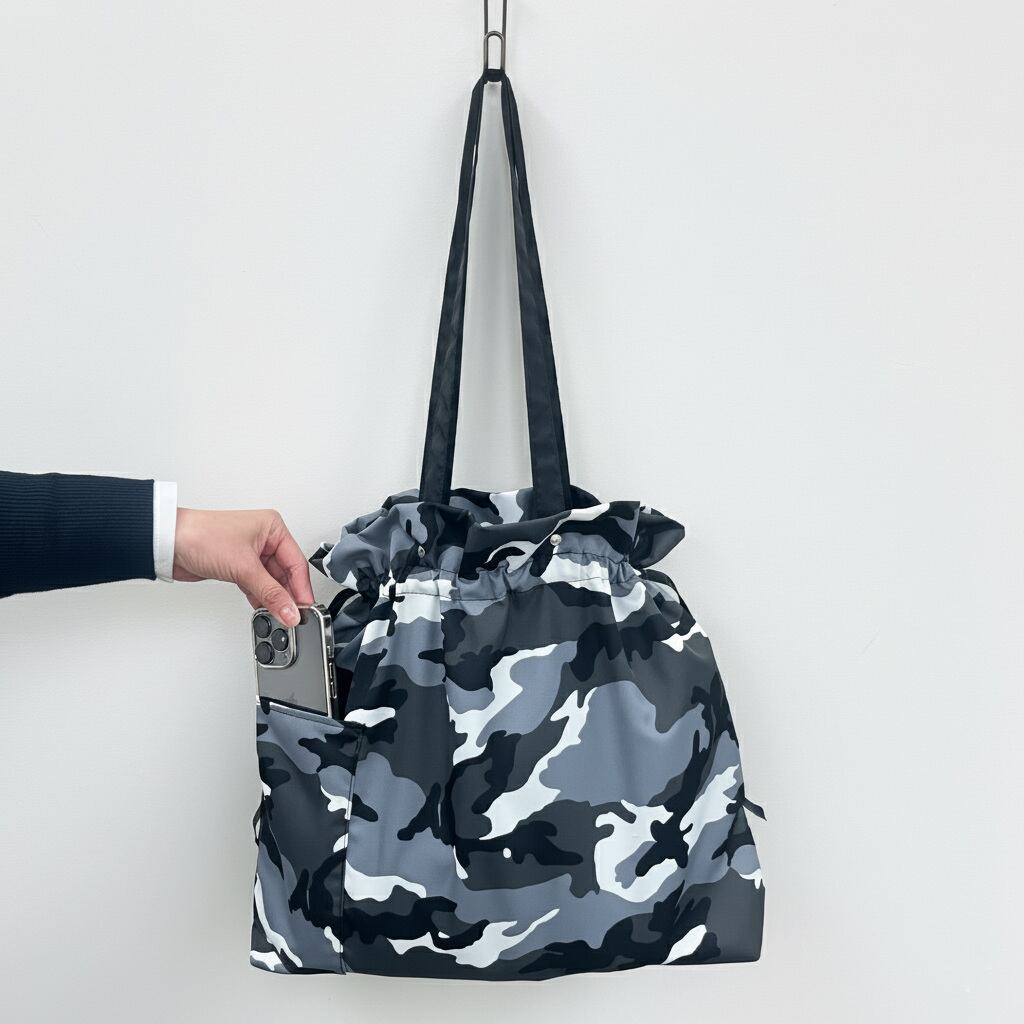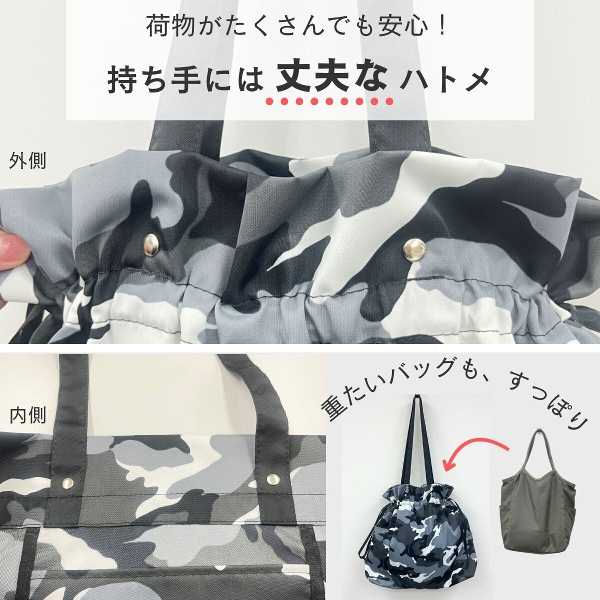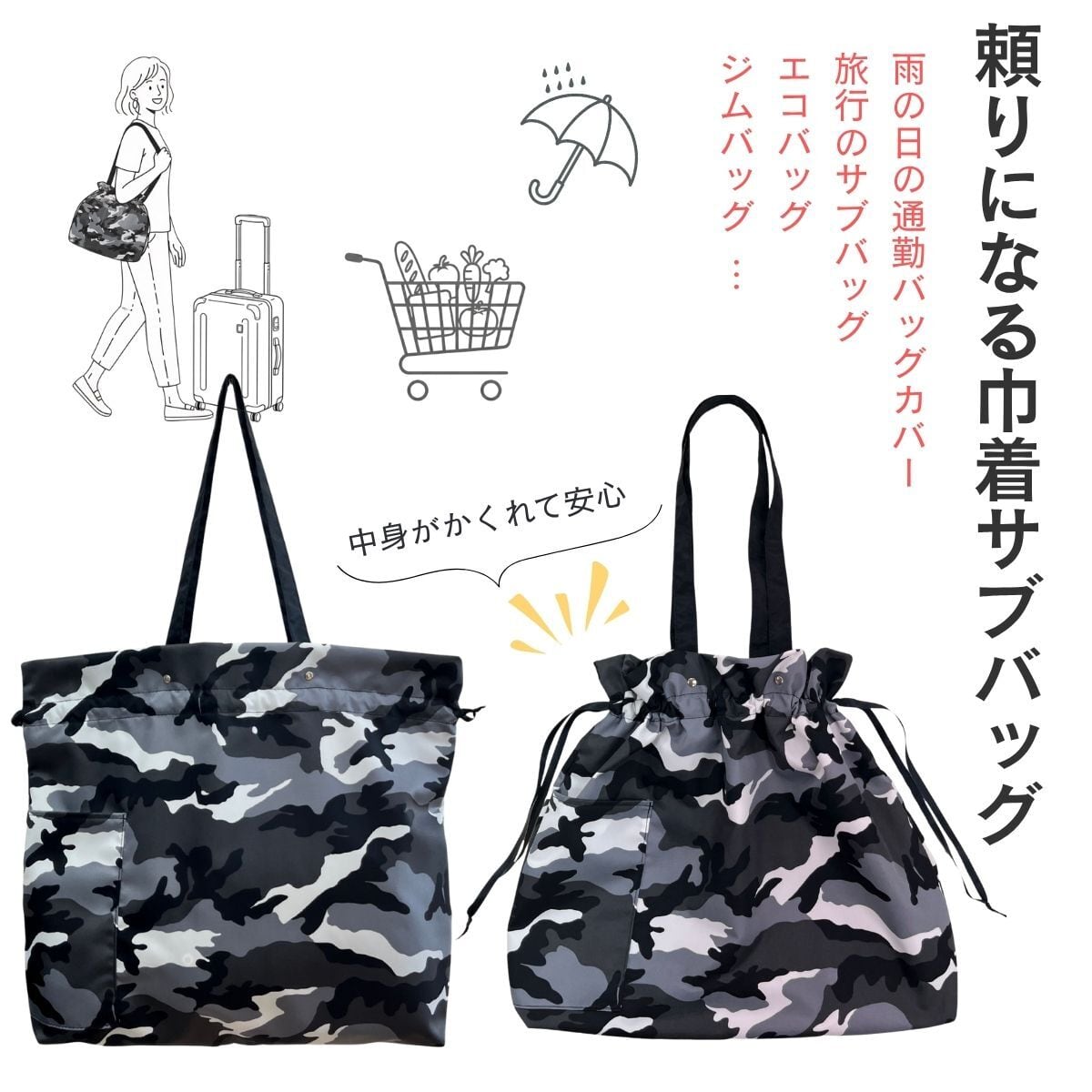 撥水 マチ付き 巾着バッグ 迷彩柄(モノトーン/グレー)| 雨の日のバッグカバー/エコバッグ/サブバッグに | 大容量 ショルダー ポケット付き