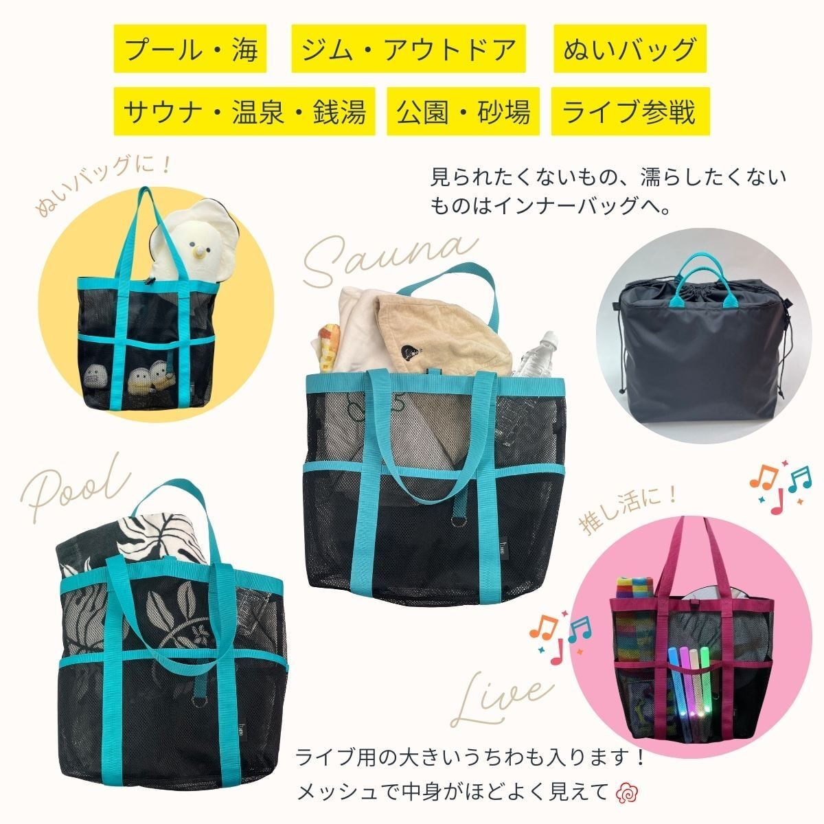 サウナバッグ スパバッグ メッシュバッグ インナーバッグ 付き 2点セット 大容量 自立 ビーチ 海 プール ジム スパ サウナ 温泉 マザーズ 推し活 ぬいバッグ hiro ヒロ 日本製