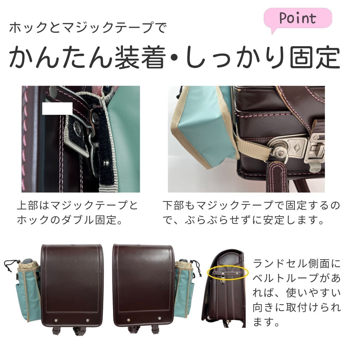 ※取付けの際、ホックをしっかり留めて、上下のマジックテープをあそびがでないようしっかりと留めてください。ランドセルに密着せず、歩行時にボトルホルダーが揺れる状態での取付けは、外れる可能性がございます。